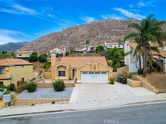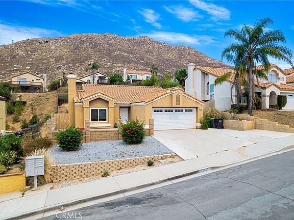 Beautiful turnkey, single-story 3-bedroom and 2-bathroom home with views of the hillside, mountains, city lights and sunsets for miles from inside, front yard and backyard now available in Moreno Valley! 1,290 square foot home resides on a spacious 9,583 square foot lot, boasts beautiful exterior stone & brickwork pavers, and features bright and open, airy floorplan. Large family room features cozy fireplace, vaulted ceilings, laminate faux wood flooring, dual pane windows with blinds, and brilliant paint. Living room features beamed ceilings, exquisite chandelier, laminate faux wood flooring and gorgeous wall paint. Large kitchen has stainless steel fridge, stainless steel 5 burner gas stove, microwave, farmhouse sink, bright bay window, breakfast nook, recessed lighting, blind window coverings, dual pane windows, and tile flooring. Large primary bedroom has sliding glass doors that lead to the massive backyard plus bathroom with tub/shower combo. Primary bedroom also features mirrored sliding closet doors, ceiling fans and large closet. Two large secondary bedrooms have lots of closet space - turn one bedroom into a home gym or office! One guest bedroom also has access to backyard via sliding glass door. Backyard features large concrete slab patio, covered patio with awning, plus uncovered yard with desert landscaping & enormous side yard with garden bed. Two car garage with insulated garage door, A/C Installed in 2020, furnace, washer and dryer, and water heater. Enormous front and back patios make this the perfect home to entertain in or lounge on a quiet day and watch the sun set. Lots of yard space is perfect for pets to run around. Driveway can fit 4 cars too & there's lots of street parking always! Street is low traffic and walkable. No HOA! Home near 215/60 freeways, great schools, parks, hiking trails, restaurants, shopping centers, malls, and so much more! Make this your forever home!