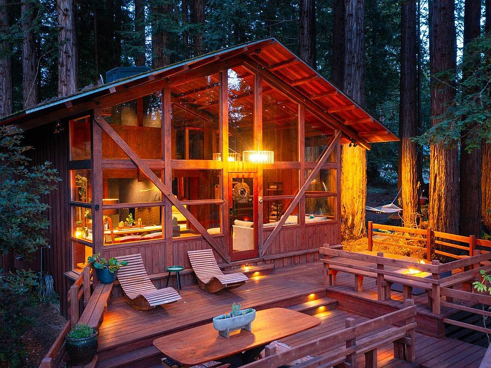 Nestled among majestic redwoods, this 2-bedroom, 1-bath A-frame home showcases coveted redwood siding and a warm redwood interior, blending seamlessly with its natural surroundings. The open-concept living area features soaring ceilings, rich oak flooring, a cozy fireplace, and tall windows that flood the space with natural light. Enjoy movie nights with a projector screen, and a stylish kitchen equipped with new stainless-steel appliances, stone countertops, and innovative seating. A newly added spiral staircase enhances the home's thoughtful design, leading to a loft-style bedroom with a built-in dresser. The property functions like a three-bedroom, with a detached cabin offering its own bath for added flexibility. Designed for relaxation, the outdoor spaces include a bocce ball court, barrel-shaped sauna, and a 12-person spa. Multiple decks create inviting gathering areas, complemented by a fire pit and hanging daybed for peaceful respites. This fully furnished sanctuary is a rare opportunity, providing an immediate and exceptional living experience that combines comfort and convenience in a peaceful setting. Seize this incredible opportunity to make it yours today.