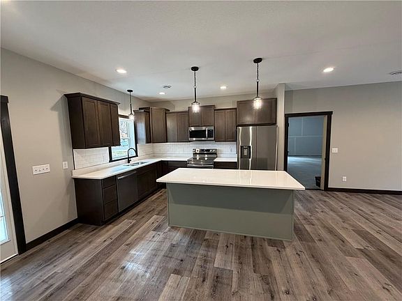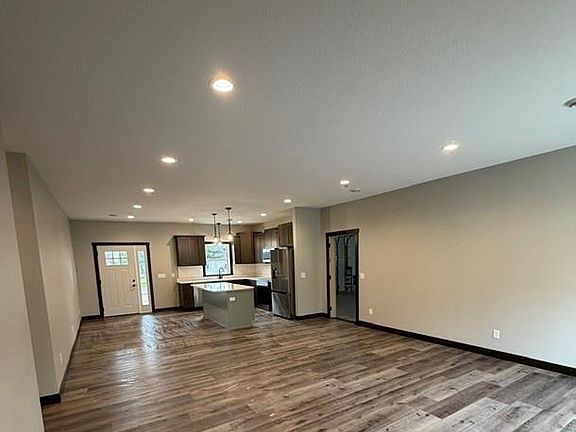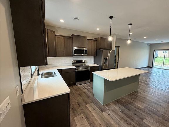 Move-in ready new construction ranch in Clear Lake, WI This quality-built slab-on-grade home offers 1,656 sq ft of single-level living with 3 bedrooms, 2 bathrooms, and an oversized 936 sq ft 2-car garage. The open-concept layout features 9 ft ceilings, luxury LVP flooring, solid wood doors, and custom trim throughout. The kitchen includes quartz countertops, an island, custom cabinetry, and stainless steel appliances. The private primary suite offers a walk-in closet and a spacious bath with double vanity and custom tile walk-in shower. Additional features include a large laundry/mud room, spray foam insulation with blown-in attic, forced air heating (in-floor heat plumbing ready?boiler optional), and energy-efficient construction. Exterior highlights include vinyl siding, cedar-wrapped posts, covered front porch, poured concrete back patio, paved driveway, and completed landscaping. Located on a quarter-acre lot in a quiet Clear Lake neighborhood, this home is ideal for anyone seeking modern comfort with low-maintenance living.