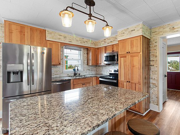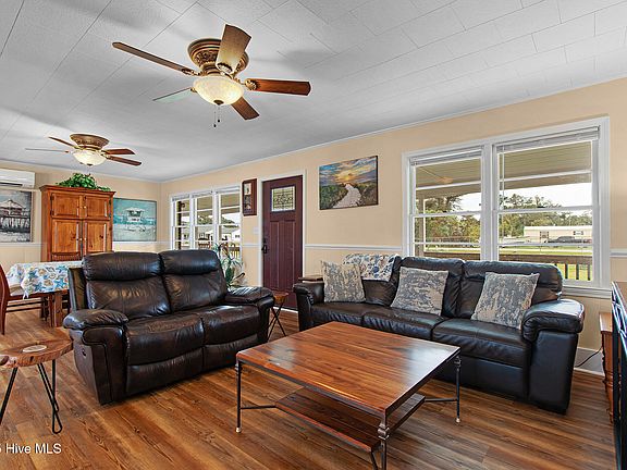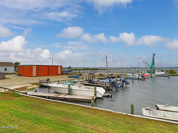 Discover a unique waterfront property on over 4 acres at 221 Bayview Drive! This fully furnished 2 bedroom, 2 bath home with a flex room features a desirable split floor plan and an open, light-filled design. Enter into the main living area, where the kitchen, dining, and living room flow seamlessly together with abundant natural light, LVP flooring, and views of the water. The bright kitchen is finished with granite countertops, a tiled backsplash, and a center island with bar seating, perfect for entertaining. Two bedrooms share a full bath just off the living space, while an additional flex room with an unpermitted private bath is accessible from both the dining area and porch. Each room has their own mini-split unit, making it easy for everyone to feel comfortable! Outside, the wrap-around porch expands to a spacious back deck and patio, creating the perfect setting to relax or entertain on the water. Here the creekside setting is the star, with 10 boat slips and kayak storage, you can be on the water in minutes. The property also includes a large metal workshop garage, fenced yard, and a charming shed with its own fenced area. The grandfathered 2 bed/2 bath Road Warrior camper with a deck and covered hot tub offers extra space for entertaining guests, though once removed cannot be replaced. Currently used as an Airbnb, it is the perfect investment property, weekend getaway, or primary residence! Located on Harkers Island's peaceful bayside, this property offers the charm of a quiet coastal community just minutes from the Cape Lookout National Seashore and a short drive to historic downtown Beaufort. Don't miss out on this one-of-a-kind spot where coastal living and investment opportunities meet.