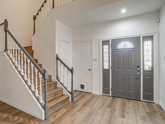 Situated in highly sought-after Valley Ranch in the Barrington Court community! Truly special! Valley Ranch is known for its beautiful canals, green spaces, parks, and miles of connected walking and biking paths and leads to Champion Trails. Easy access to I-35, George Bush Turnpike, and 635-plus just 15 minutes from DT Las Colinas and the Toyota Music Factory. Pet-friendly! #1 in style, layout, and class! You are immediately met w-a dramatic living area featuring an approx. 30-foot ceiling-instant WOW factor. The open view to the kitchen and fireplace, large windows, and striking open stairway make the entire main level feel bright, airy, and expansive. The kitchen flows seamlessly to the dining and family areas and features under-cabinet lighting, contemporary pendant fixtures over the white farm sink, freshly painted cabinetry, stunning quartz countertops, custom backsplash, and abundant storage. The laundry room is convenient nearby. Updated downstairs full bath showcases a custom shower w-bench and shampoo niche, beautiful black granite countertop with vessel sink, striking custom vanity, bronze-black faucet. The downstairs bedroom impresses with soaring ceilings, a chic chandelier, and French-style doors leading to a rare iron-fenced private patio-hard to find in this community! Former model home. New paint throughout. Upstairs, the spacious primary suite offers high ceilings, great natural light, and a luxurious bathroom with a new vanity, new flooring, gorgeous updated shower, and recently added separate bathtub with fresh tile. Newly installed luxury vinyl plank flooring throughout provides style and easy maintenance. The HOA dues cover an almost unbelievable amount: internet package, cable package, water, trash, sewer, all exterior maintenance, structure maintenance, and master insurance. The water heater was replaced in August 2025! HVAC is three years old. Truly exceptional place to call home-beautifully updated, thoughtfully designed, and move-in ready!