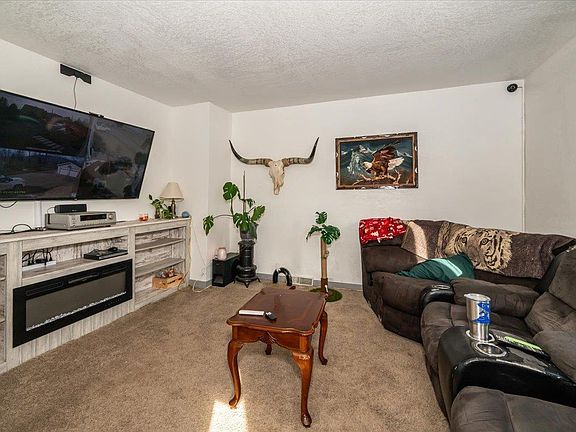 - Description: Carpeted, built-in wall unit with electric fireplace