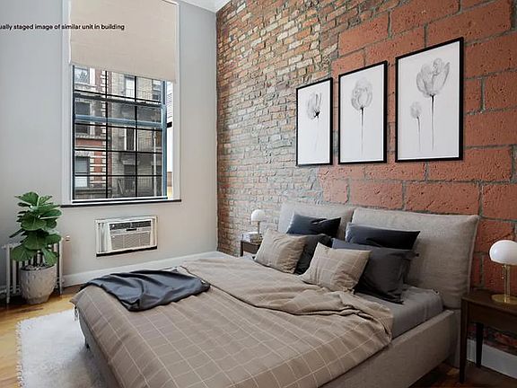 Exposed brickModern bathroomHigh ceilingsStainless steel appliancesHardwood floorsModern kitchen