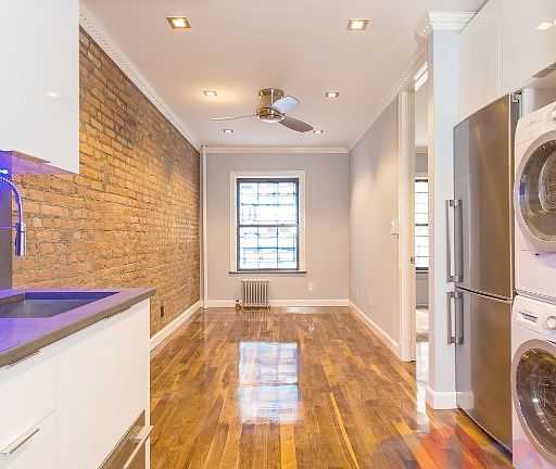 Exposed brickModern bathroomHigh ceilingsHardwood floorsUpdated kitchenStainless-steel appliances