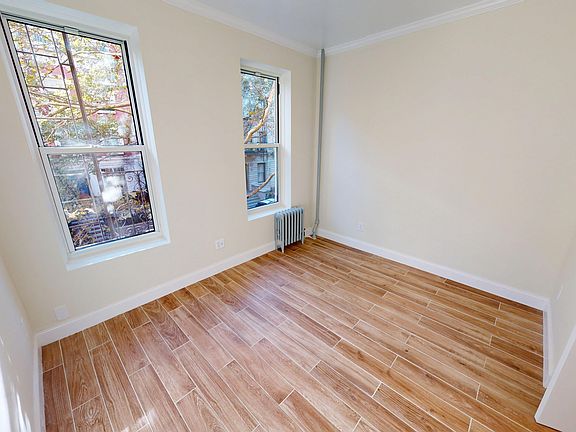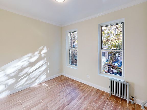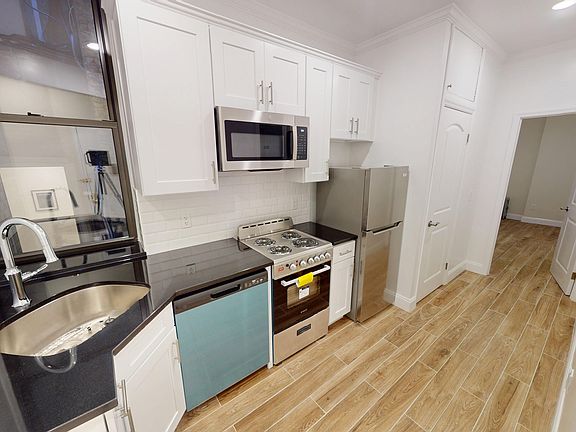 You'll be the first to call this gorgeous, luxe two-bedroom rental home after it was thoughtfully renovated late this summer. With 9 foot ceilings, crown moldings throughout recessed lighting, brand-new appliances, and brand new flooring-- you're getting the best of modern renovations in a classic pre-war building in the classic neighborhood of Your classic and crisp kitchen has all stainless steel appliances including dishwasher and built-in microwave, black granite countertops, retractable sink sprayer, tall cabinets and a ventilation window. Laundry is a breeze with your very own, brand new GE-brand stackable washer/dryer combo unit with additional storage above. The primary south-facing bedroom has two new windows looking out over the tree-lined street, double-doored floor-to-ceiling closets with two shelves and two sets of clothing-hanging closet bars and fits a queen bed plus a dreseser and nightstand. Your living space can fit your entertaining needs with space for dinning as well and it also has a similar floor-to-ceiling closets with two shelves and bars for additional storage. The second bedroom faces internally, very quiet, with two windows and a floor-to-ceiling closet with two shelves and two sets of clothing-hanging closet bars. Your sleek, crisp and fresh bathroom is brand new to you and has ample storage in the vanity, the mirrored cabinet, and the marbled corner shelves in the stylish glass-doored shower.