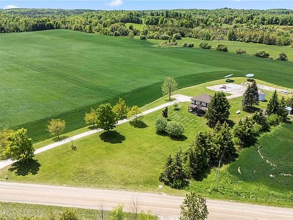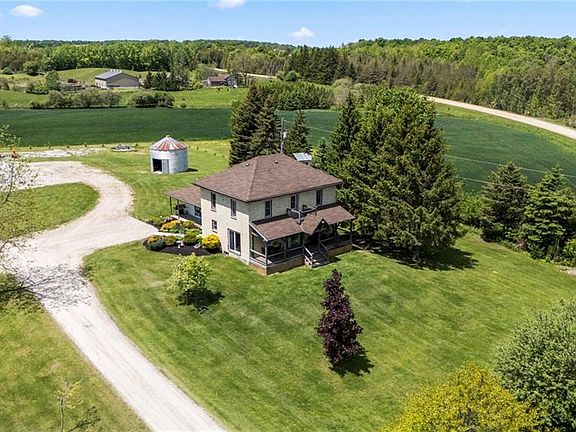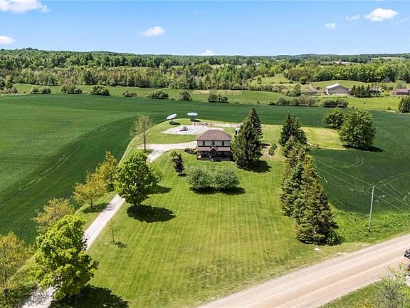 Welcome to your private country escape this beautifully maintained two-storey brick home is nestled on a picturesque 2-acre lot with mature trees, offering peace and privacy. Perfectly blending rustic charm with modern comfort, this property is just a short drive from town amenities. Inside, you'll find a thoughtfully renovated open-concept kitchen and dining area that serves as the heart of the home. Featuring abundant cabinet space, a large center island with breakfast bar seating, the kitchen is ideal for everyday living and effortless entertaining. A cozy propane fireplace adds warmth to the dining space, which opens to the backyard through a convenient walk-out perfect for hosting or simply enjoying the outdoors. The main floor also includes a spacious laundry area for added convenience, a full 4-piece bathroom, and not one but two inviting living rooms, each offering serene views of the surrounding landscape. Upstairs, the generous layout provides plenty of room for the whole family, with 3 bedrooms, and a second 4-piece bathroom. The large basement is unfinished but features a versatile space measuring 28 x 21, with a walk-up to the outdoors and offers endless potential whether you choose to finish it as additional living space, use it for storage, or create the ultimate workshop. This home has updated vinyl windows, propane forced air heating and features a beautiful front covered porch you can enjoy your morning coffee from. Solar panels are an added income bonus, generating approximately $8,000-$12,000 per year. There is also a 32 x 64 concrete pad on the property waiting for your new shop. This home offers the best of country living with modern comforts. Don't miss your chance to own this country retreat move-in ready and full of potential.