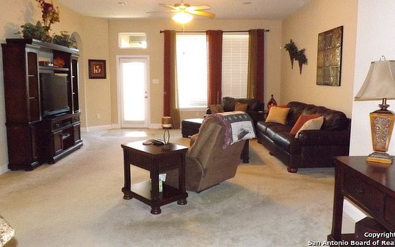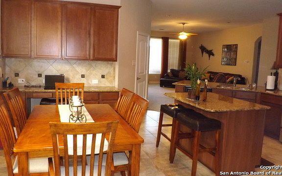 Gorgeous 1.5 story home with an open floor plan with just a Large game room & full bath upstairs. Big beautiful, functional kitchen has granite counter-tops, lovely cabinetry, stainless steel appliances, (including great fridge), nice island, built-in desk & sunny breakfast area! Great master suite separate from the 3 other bedrooms. Covered patios front & back, for those relaxing mornings & evenings. EZ commute to San Antonio or Austin & very close to RAFB! Great schools. Nearly New & Very Gently Lived In!