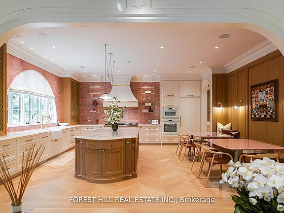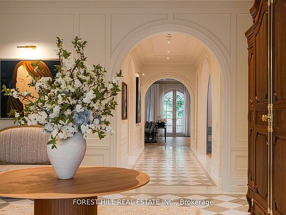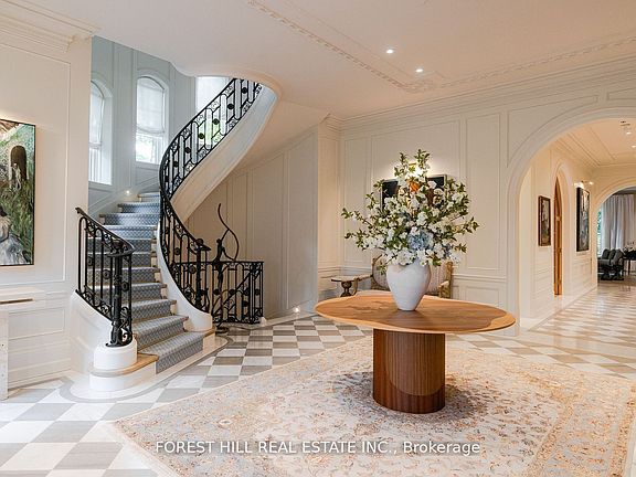 Welcome to 221 Forest Hill Road, an architectural triumph with nearly 13,000 sq ft of living space on a private 17,000 sq ft lot, nestled along the Beltline Trail in the heart of one of Toronto's most exclusive enclaves. This estate represents the pinnacle of bespoke luxury, meticulously brought to life by the city's finest: JTF Homes, Lorne Rose Architect, and Dvira Interiors. Clad in hand-selected limestone and inspired by the romance of the French countryside, the residence evokes the timeless elegance of a Provencal chateau. Arched windows with weathered-blue shutters, a stately turret, and a gracefully symmetrical facade create a striking first impression. A dramatic arcaded loggia opens onto manicured grounds and landscaping imagined by Fitzgerald and Roderick, featuring a lap pool, sports court, and lavish gardens that offer privacy and tranquility. The interiors are nothing short of breathtaking curated blend of old-world grandeur and modern refinement. The main level features soaring ceilings and a dramatic spiral staircase. Chevron-patterned white oak floors, arched passages, imported wallpaper, and tailored lighting reflect impeccable attention to detail. The formal dining room (seating 20) flows effortlessly into a statement kitchen adorned with hand-painted Portuguese tiles and custom cabinetry by Emanuele Furniture Design. The sunlit family room is anchored by a hand-carved fireplace and opens onto the gardens through elegant French doors. The crown jewel is the primary suite, a true sanctuary with vaulted ceilings, whimsical wallpaper, arched detailing, and a fireside lounge that creates a retreat-like atmosphere. The piece de resistance: a couture-inspired, two-storey dressing room with a spiral staircase and chandelier, paired with a spa-like ensuite clad in expansive stone and Shirley Wagner fixtures. The lower level features a sprawling rec room, games lounge, prep kitchen, gym, cedar sauna, and a home theatre for the ultimate cinematic escape.
