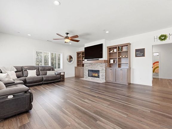 Modern country living at its best! Custom-built in 2019, this stunning home blends modern luxury with country charm! Step inside to an inviting open-concept layout featuring tall ceilings, wood plank flooring, and a stacked-stone fireplace with custom built-ins. The gourmet kitchen steals the show with quartz countertops, a large island, stainless steel appliances, and a 5-burner gas range, perfect for cooking and entertaining alike. The spacious primary suite offers two walk-in closets and a spa-inspired bath for your own private retreat. Energy-efficient details include LED lighting, central A/C, plantation shutters, fire sprinklers, and rain gutters. Outside, enjoy a fenced yard with lush turf lawn, a dedicated dog run for your furry friends, and gorgeous mountain views that make every sunset special. A detached 2-car garage plus extra parking provides plenty of space for vehicles, toys, or a workshop. VA & FHA terms welcome. Experience the perfect mix of peace, privacy, and convenience. This home truly checks all the boxes!