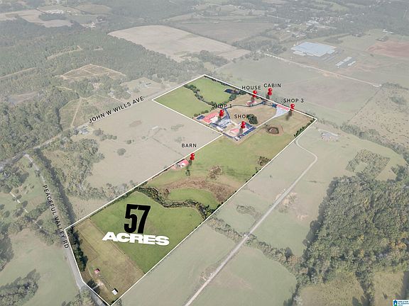 One-of-a-kind properties like this don't come on the market often. This listing is sitting on 57 acres, features include a 2076 sq ft home, a 1929 sq ft guest house, a 15,076 sq ft warehouse with 8 roll up doors and office space, a 8375 sq ft warehouse with 3 roll up doors and office space, a 3600 sq ft warehouse with four roll up door and office space, and a cabin. Located just minutes from I-20 this property is in a prime location with 944 feet of road frontage along John Wills Road, and 402 feet of frontage on Peaceful Valley Road. Priced at $700,000 below the appraisal, this property is perfect for a family looking for a large farm or a new business.