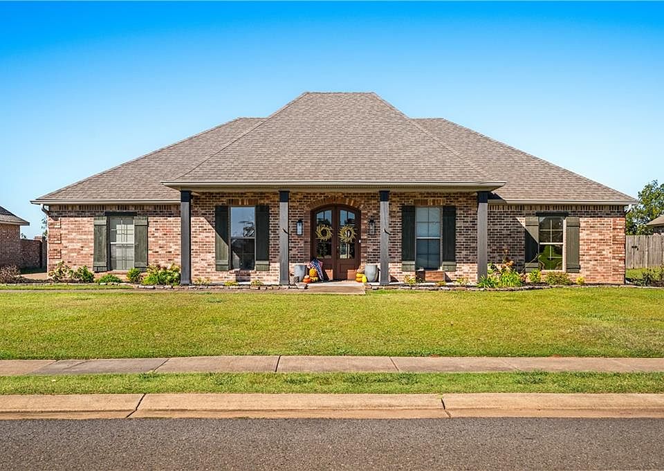 Built in 2008, this well-maintained Acadian-style home is located in St. Andrews Links Estates and sits directly along the 7th fairway. The home features four bedrooms, two full bathrooms, and one half bathroom in a split floor plan layout. The foyer opens to a formal dining room and a living area with a custom gas fireplace and mantle. The kitchen offers ceramic tile flooring, granite countertops, an eat-at bar, walk-in pantry, and stainless steel appliances including a double-door refrigerator, built-in microwave, dishwasher, and gas range. A breakfast area with bay-window seating adjoins the kitchen. The laundry room includes built-in cabinetry, a sink, and is located next to the half bath and double carport. The main bedroom has a tray ceiling, large walk-in closet, and an adjoining bathroom with double vanities, a jetted tub, and separate shower. The additional bedrooms are spacious with walk-in closets and a hall bathroom with a tub/shower combination. Exterior features include a fully fenced backyard with wrought-iron fencing along the golf course, covered brick patio, full gutter system, front and rear landscaping, and a roof replaced within the last few years. Home is on city utilities including electricity, water, natural gas, and twice-weekly trash pickup. HOA $425 annually.