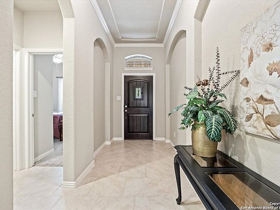 Located within the highly regarded Schertz-Cibolo-Universal City ISD and zoned to Steele High School, this one-story home blends thoughtful design with everyday functionality. Its layout offers four bedrooms and three full bathrooms, striking a balance between open living and private retreat. The interiors are filled with natural light, giving each space a warm, welcoming feel. In the main living area, the kitchen stands as the central hub, anchored by a substantial island with granite countertops. Designed for connection and ease, this kitchen naturally flows into the adjacent living area, making it ideal for both quiet mornings and lively gatherings. One feature that sets this home apart in today's market is the dedicated dining room. Separate from the main open-concept space, it offers a place for formal meals, celebrations, or simply a quiet evening dinner-something increasingly rare in newer homes. Its presence gives the layout a sense of tradition and versatility that's hard to find. The primary suite is thoughtfully positioned at the rear of the home for added privacy. It offers generous space, while the en suite bath includes separate vanities, a garden tub, and a large shower-comfortably designed for everyday living. The additional three bedrooms are well-proportioned, each with access to a full bath, providing flexibility for guests, family, or work-from-home needs. Outdoors, an oversized covered patio creates a shaded extension of the living space, with ample room for relaxing or entertaining. The home has been carefully maintained, with low-maintenance surfaces throughout most of the interior, ensuring it stays looking its best with minimal effort. In a market where many homes prioritize trend over function, this residence quietly delivers both-a timeless layout with practical features, all set in a desirable community. Welcome Home.