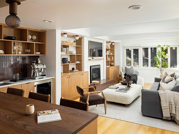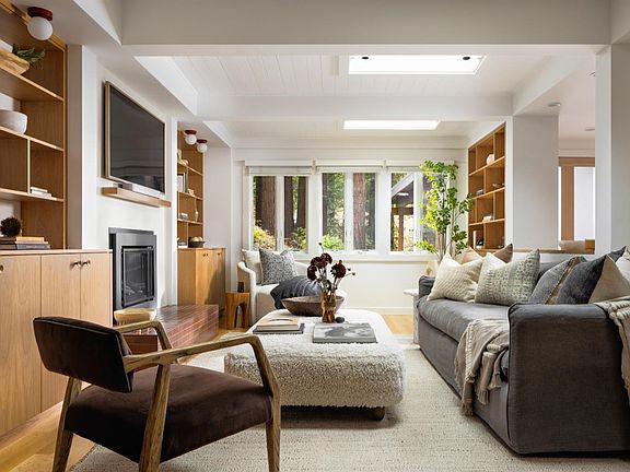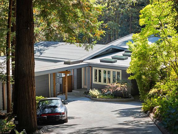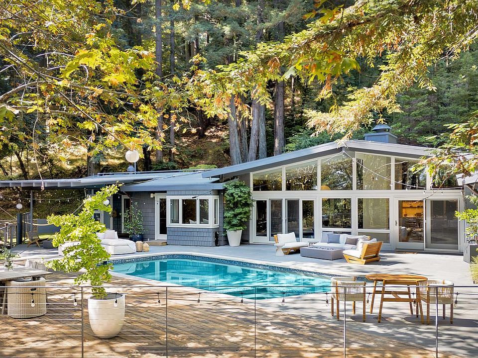 If living in a modern treehouse with midcentury modern vibes sounds like a dream, welcome home. Featured in both Dwell and Sunset Magazine and designed by Cathie Hong Interiors, this single-level retreat in Kent Woodlands captures the easy rhythm of Marin life. Set on a sunlit 1.11 acre street-to-street lot with a private staircase to the flats, 221 S. Ridgewood unfolds across 2,834 sqft with clean lines, natural materials, and a soft, modern organic palette. The chef's kitchen was built for real life-custom oak cabinetry, birch drawers, marble counters, Heath Ceramics tile, and integrated appliances-all grounded by thoughtful craftsmanship. Two distinct living areas bookend the home: one with new skylights and designer lighting, the other with vaulted wood-paneled ceilings and a nod to midcentury warmth. Outside, a saltwater pool, hot tub, two firepits, and a turfed play yard create space to gather and unwind. With lush gardens blooming with Magnolia, Japanese Maples, Dogwood, and Rhododendrons, there's always something in bloom. A detached garage, private driveway, and nearby trail access to Phoenix Lake and Bald Hill offer daily connection to nature, while Woodlands Market, Guesthouse, top-rated schools, and the 101 are just minutes away. This home truly has it all.