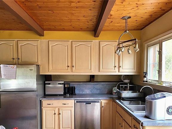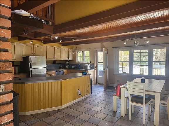 Burrillville near Spring Lake. Solid A-Frame construction. Homes of this architectural style are very rare. With its wood details throughout, there is warmth and character that you don't get from a traditional style home. One can easily imagine decorating these halls for the holidays. Entering into the home you are greeted by the floor to ceiling brick chimney and dramatic view to the 2nd floor loft. The kitchen is open and spacious with dining area that will fit a large dining table. Take the party outside to the oversized deck. Also on 1st floor is office space, full bath, and bedroom. On 2nd floor are two bedrooms. There is also tons of attic space above. The lower level features a finished basement with ceramic tile floor, baseboard heat, plus a pellet stove that can heat the entire space. This is a great space for game day/office area/media room. There is space for a 2nd bathroom on the lower level. The lot is .47 acres and flat with garden shed and above ground pool. Updates include Weil-McLean boiler, SS oil tank, chimney flue, and updated well pump. Connected to public sewer. Priced for a quick sale and will be ready for immediate occupancy.