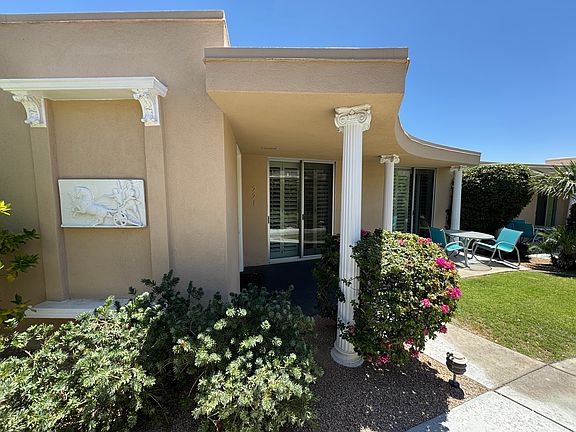 Sparkling central poolMajestic san jacinto mountainsManicured statue-lined lawnsPrivate rear patioGlass-brick-lined patiosWell-designed layoutBuilt-in bar