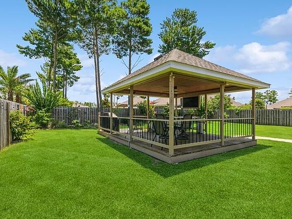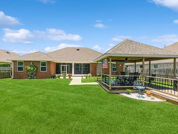This stately all brick, 4 bedroom, 3 bath home features a designated office AND a separate dining room in addition to 4 sizable bedrooms! This welcoming, updated interior is sure to impress with wainscoting in the dining and breakfast room, crown molding in all living areas, and 10' -12' ceilings, custom pull out shelves in kitchen cabinets with an extended island and custom storage underneath; residents also benefit from central gas for heat, ac, water heater, oven, and range in the event the grid is out! The oversized primary suite w/ owners retreat is the perfect private sitting area to enjoy your morning coffee behind closed doors; overlooking the private backyard and colorful, mature landscaping. You will love to entertain friends and family in the covered screened in back porch or follow the paver walkway to the 16 x 16 custom built gazebo featuring recessed lighting and a ceiling fan, along with numerous electrical outlets for your maximum comfort. Hammock Bay is a premier, bayfront master planned community located just 15 minutes north of the white sand beaches of the Emerald Coast. A 6,000 square foot clubhouse offers residents use of the movie theatre with auditorium seating, a full caterer's kitchen to include wet bar and dining area, childs play room, and lounge overlooking the lake and pool area. Numerous on site workout and fitness facilities, competition lap pool, additional 4 Resort-style pools, pickleball courts, tennis courts, basketball court, large playground, outdoor kitchen/gas bbq areas. A Bay front club house with fishing pier extending 500' in to the bay, an amphitheater like stage with jumbotron screen, are just a few attractions with more on the near horizon! All residents at Hammock Bay will enjoy year-round social events as well as a vibrant and active Town Center. Consider this an invitation to experience the Hammock Bay Lifestyle by contacting me today for an updated list of this months community events calendar!