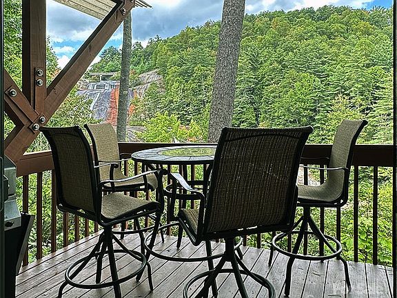 Unique, private location adjoins mesmerizing Toxaway Falls. This unit has exceptional views of the waterfall from all living spaces. It features a great room, stone fireplace w/gas logs, dining & kitchen. The kitchen provides excellent appliances & is fully equipped. Two bedrooms & 2 full baths – the primary is ensuite. The deck is accessed by 2 sets of sliding doors, is covered, has a heater for cooler evenings, and a grill for your culinary skills (with dedicated gas line). Deck furniture is included. A great spot for your morning coffee & evening refreshments! From this large private lot you will not see other houses or condominiums. The land across the river is a part of Gorges State Park & will not be developed; so, your privacy is assured. Follow the trail to the bottom of the falls for a refreshing swim or catch a fish for dinner! Enjoy a refreshing swim in the heated community's pool. Offered fully furnished with few exceptions. Units in this building don't come on the market often, so don't delay. These units have the best view of the waterfall of any others in the subdivision. No other condos or houses are in the wonderful view!