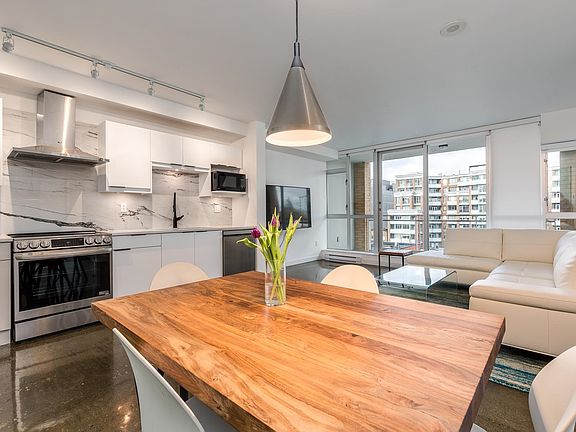 Stunning fully renovated loft style 925 sqft with a 91 sqft patio, view this 2 bedroom 2 bathroom condo at this luxurious property called V6A. Move into this trendy & diverse neighbourhood. Sleek modern renovation in 2023, features include, white cabinetry, sleek black hardware, marble countertops, white carrara marble blacksplash, SS full sized appliances, motorized blinds throughout, sleek open-concept design, polished concrete floor. It also has a 71 inch bath tub in the master ensuite, dimmer switches & more. V6a has a concierge service, fully equipped fitness centre with state-of-the-art cardio equipment & free weights. Open house Sat Nov 8th 2-3pm.