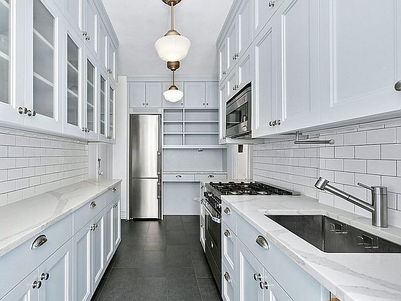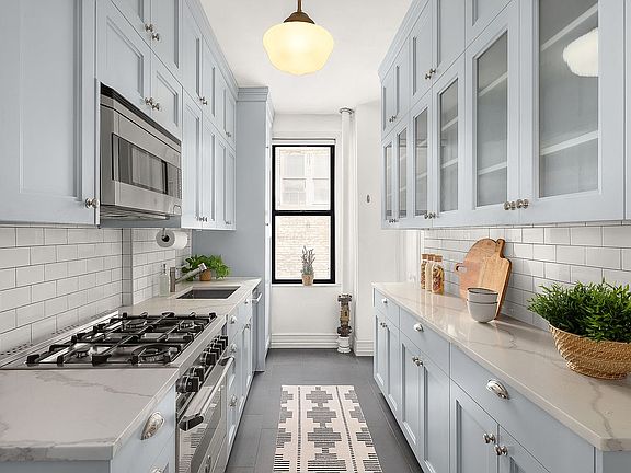 Welcome to this graciously proportioned prewar one-bedroom offering a blend of traditional details and modern updates. The spacious layout features high ceilings, decorative moldings, skim-coated walls, recoated lacquer hardwood floors, and new narrow footprint radiators. The fully renovated kitchen includes high-end stainless-steel appliances, (Bosch, Liebherr, and Bertazzoni) undercounter lighting, slate flooring, a Strada Basaltina Sabbiata countertop that looks like marble without the upkeep, and space for a washer/dryer (with board approval). There is a former half bath off the kitchen which can be recreated.