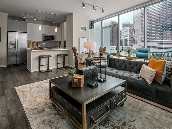 - Exterior features: Availability 24 Hours, Barbecue, Bike shop and storage, Conference Room, Dry cleaning pickup-drop-off station, Electronic home and amenity keys, Energy efficient design, Lobby seating with transit screen, Lush quartz countertops, Luxury plank style flooring, Mail room, Massage Room, Modern fixtures, Nest E thermostats in each home, On-Site Management, Package Receiving, Penthouse units with wine coolers, Stainless steel appliances, Storage room with individual storage cages, Sundeck, TV Lounge, Thermally fused cabinets with soft-close, Yoga room with Wellbeats