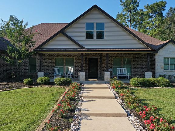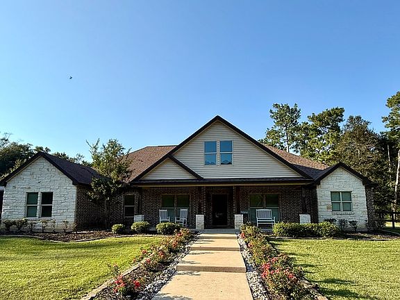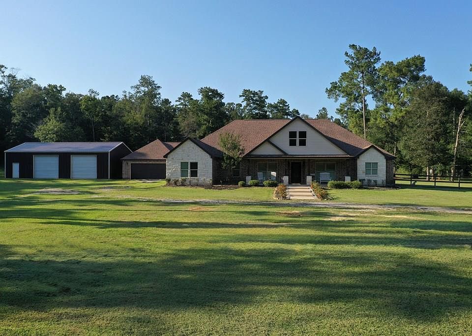 Nestled in the pines and unseen from the road, this custom brick-and-stone residence balances everyday function with quiet seclusion on 26+ acres. Inside, an open concept invites gathering—granite counters, stainless appliances, and an oversized island center the kitchen, while a hidden walk-in pantry keeps the look clean. A wood-burning fireplace adds glow to the main living area, complemented by secondary living and dining spaces for effortless entertaining. The primary suite feels like a retreat with dual closets and a spa-inspired bath featuring a bench-seat shower, jetted tub, dedicated vanity, and abundant cabinetry. On the opposite wing, a Jack-and-Jill bath smartly connects two bedrooms. With an attached two-car garage, storage throughout, and a substantial on-slab shop for vehicles, equipment, or hobbies, this homestead is ready for whatever comes next—enjoy it mostly wooded or shape it to your vision.