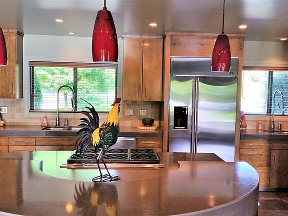 Don't let this one pass you by. Country living in town. Sits on almost 1 acre of beautifully landscaped grounds. Lots of trees and plants. Large open kitchen with cement counters and an island with built in gas cook top. Kitchen also features stainless steel appliances, built in wine cooler, large pantry area. Relaxing family room with fireplace. Indoor laundry room with lots of storage cabinets. Large dining room with fireplace. This home is an entertainers delight. Outdoor patio with a great view of the grounds. Large work shop in back. RV parking. Gardening area and a small orchard of assorted fruit and citrus trees. One of a kind property.