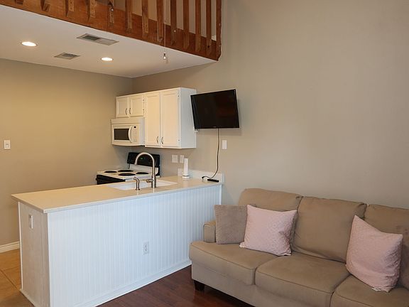 with meticulously Updated Kitchen and Bath. Quartz Counters, Modern white cabinets, Super nice Clean Appliances Wall mounted Led TV. Plush Vanity area with great counter space with large framed mirror and led vanity light. Huge bedroom with high vaulted ceiling and built in chest of drawers. Large Tree covered patio. Loft is enormous and adds a second bedroom area even bigger than the one downstairs. Extra exterior locked storage is a big plus. Condo comes with couch and bed. Has one Covered reserved parking space. Gated Entry. Water, Trash , and Parking are all included. This is So close to Campus, The UT Shuttle, Convenient Grocery Store, Target and Fast Food. All the you need is here at the Best Price Ever!