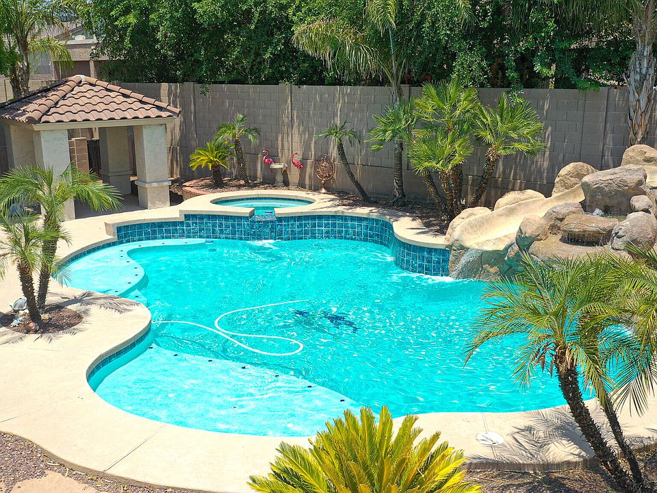 Location! Location! Location! Welcome to this gorgeous open concept floorplan with Vaulted ceilings, a refreshed kitchen and a spacious den and full bathroom downstairs. These are just a few things that make this a stunning residence. Conveniently located close to the TSMC on a desirable corner lot in a gated community this home offers, easy access to Norterra for shopping, dining, entertainment, schools, parks with hiking and biking trails, and major highways. Don't forget about the absolutely amazing pool with a waterfall, slide, and grotto, huge patio and a Ramada! New exterior paint, soft water loop, 3 car garage w/cabinets galore. Stop by the beautiful park steps away on the walking path.