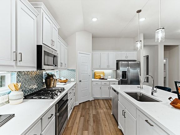 MLS# 21091491 - Built by Pacesetter Homes - Ready Now! ~ 2210 Walden Pond Boulevard is a 4-bedroom, 3-bath former model home filled with designer upgrades and thoughtful touches throughout. The open layout includes a private study, spacious game room, and an extended covered patio perfect for entertaining. A soaring cathedral ceiling and added windows in the family room create a bright, inviting space centered around a cozy fireplace. The deluxe kitchen features 36 hybrid cabinets, quartz countertops, a beautiful herringbone tile backsplash in classic blue, pot and pan drawers, a pull-out trash bin, and a large island with pendant lighting and a pop-up outlet. The master suite offers a luxurious retreat with a deluxe bath including a separate tub and shower and engineered marble countertops. A utility room with a utility sink adds everyday convenience, while full gutters wrap the entire home for added protection and curb appeal. Every detail in this home reflects its model home quality and charm. Your Pacesetter Home comes equipped with a suite of smart features designed to enhance everyday living.-Ring Video Doorbell-Brilliant Smart Home System to control lighting and music-Honeywell Smart T6 Thermostat for energy savings-WiFi-enabled Garage Door-Rainbird Wifi-capable Sprinkler System Plus, enjoy added support with White Glove Service a personalized, post-closing appointment to get all your smart home features connected and ready to use.