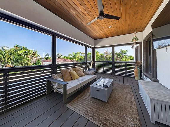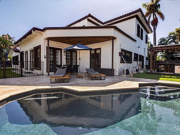 Spectacular renovated 6BD/6BA estate on an oversized lot just minutes from the beach! This modern home features a bright, open floor plan with an updated, first floor primary suite, office, and junior suite on the main level plus three en-suite bedrooms, a loft, and a huge screened terrace upstairs. The bedrooms offer generous space, custom closets, and beautifully updated bathrooms. Impact windows fill the home with natural light throughout. The brand-new kitchen boasts white shaker cabinets, quartz counters, a center island with wine storage, farmhouse sink, stainless steel appliances, and a wraparound breakfast bar. Enjoy entertaining in your private backyard oasis with a covered living area, tropical pool, and fully fenced yard — perfect for the South Florida lifestyle!