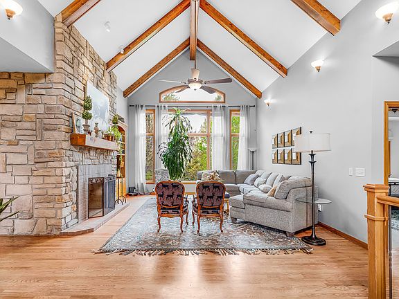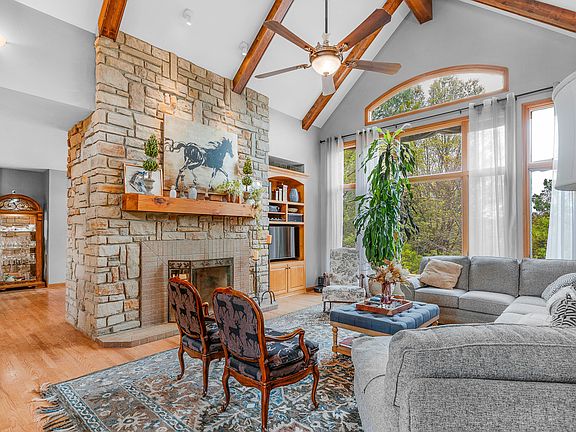 Welcome to your dream home! This beautifully maintained traditional ranch-style estate offers almost 4,500 square feet of living space, thoughtfully designed for comfort and style. Featuring 4 spacious bedrooms and 3 1/2 bathrooms, there's room for everyone to spread out and enjoy. Inside, you'll find custom cabinetry, granite countertops, and a living room with soaring cathedral ceilings along with wood beams, creating an inviting yet large atmosphere. An exquisite see-through fireplace serves as the centerpiece between the living room/dining/kitchen area. The expansive primary suite is cozy and inviting. Enjoy year-round relaxation in the heated and cooled sunroom, recently enhanced with a new 12,000 BTU mini-split system for perfect climate control. Throughout the home, you will find hardwood floors along with the spacious walk-out basement with full kitchen, office and bedrooms, full bath, luxury waterproof vinyl flooring and custom milled trim throughout. You'll love the dedicated home office, perfect for remote work or study. Large Anderson windows and a direct walk-out to the backyard flood the space with natural light. The home also boasts of a new impact resistant architectural shingled roof (2024), new HVAC system (2024), new 50-gallon propane water heater (2024), and a new car charging station in the garage. Freshly painted on the exterior (2024) and interior, the property is move-in ready and meticulously maintained. The acreage is fully equipped with two 12x24 horse run-in sheds and an automatic pasture waterer, making it an ideal setup for horses and livestock. A French drain system was installed all around the home along with the barn area. Outside you will find perfect scenery, all while enjoying the Koi pond, firepit, and freshly made pizzas from the outdoor pizza oven! Some furnishings will remain in the home, and others are available upon request/for additional $$. Horses on the property are available for $$. By Appt. ONLY. More pics coming soon