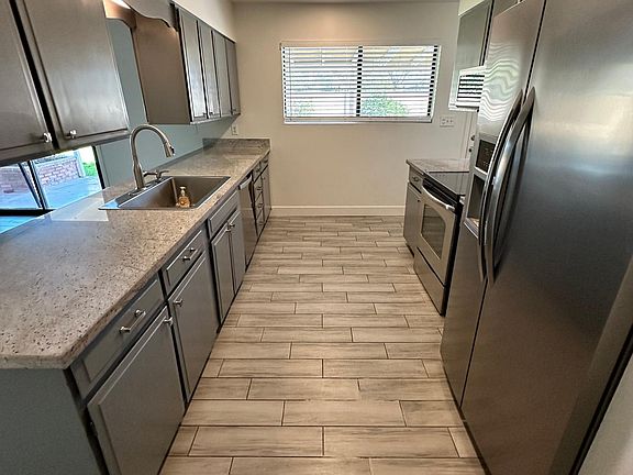 Modern tile flooringLarge common areaExposed brick wallDedicated officeGranite countertopsPlenty of storageStainless steel appliances
