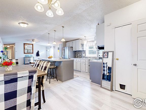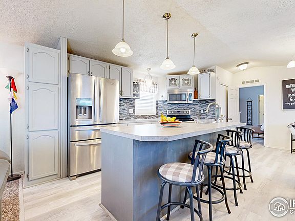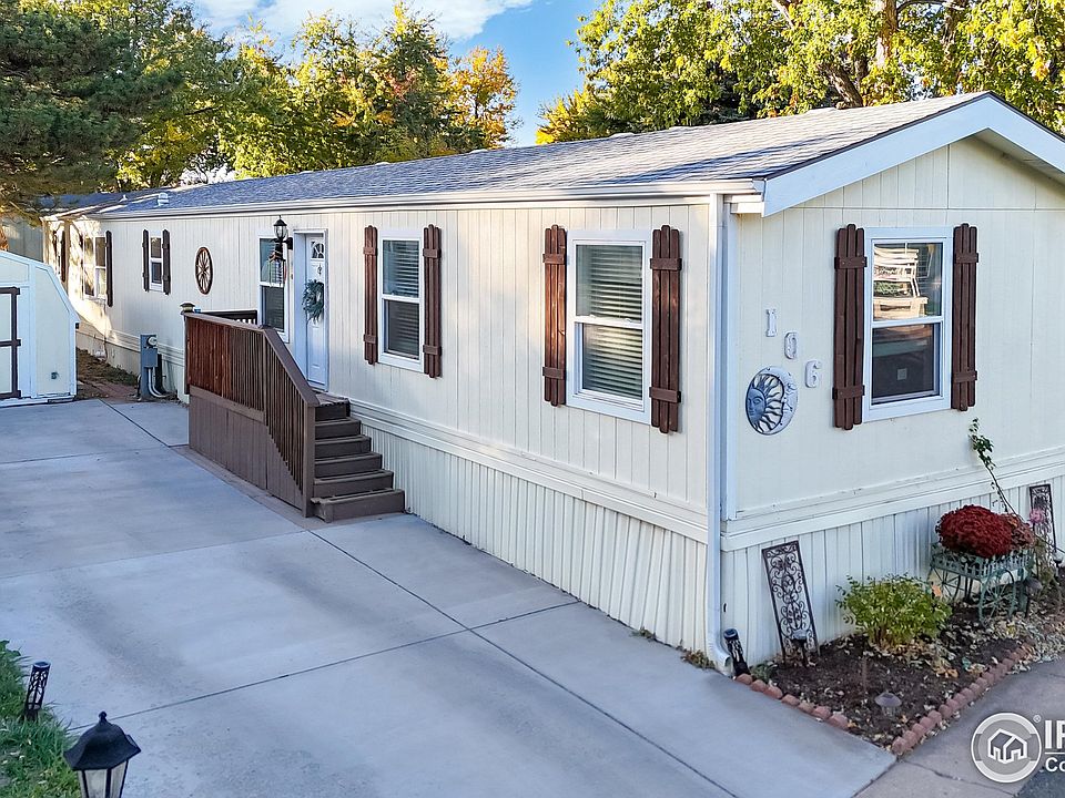 Beautiful home situated on a quiet street in Skyline Active 55+ community offering many amenities, such as a heated pool, dog park, community garden beds, and a Clubhouse with a coffee bar where residents attend events and potlucks. This home features an open concept floorplan with 3 bedrooms and 2 bathrooms. The kitchen is a chef's dream with a large kitchen island, stainless-steel appliances, a walk-in pantry, and plenty of storage and counter space. The eat-in kitchen leads to a delightful, covered deck offering a tranquil space for hosting brunch or just a peaceful place to enjoy your morning coffee. The primary bedroom includes an en-suite bathroom with a walk-in shower, and a walk-in closet with laundry (clothes washer and dryer are included). The secondary bedrooms and bathroom are on the opposite end of the home making a great set-up for a private guest suite, plus an office or hobby room. A new roof was installed in 2023. There is additional storage provided in two outdoor sheds. This lot offers multiple outdoor entertainment areas. In addition to the covered deck, there is a nice stone patio to the back of the home. Skyline community is in a superb location across the street from City Park Nine Golf Course and just minutes downtown Fort Collins featuring shops, restaurants, bakeries, and museums. Downtown Fort Collins hosts events such as Tour de Fat, local parades, and Taste of Fort Collins. To the west you have the beautiful Rocky Mountain foothills for hiking and biking, and Horsetooth Reservoir for fishing & boating. Enjoy the many attractions Fort Collins has to offer all just minutes away from your front door. Call today to schedule your tour of this lovely home. Skyline Park is an owner-occupied age restricted park with base lot rent of $984 per month. Pets allowed. Pet fee is $10 per month. Lot rent and pet fees are subject to change. Seller is offering 2 months lot rent free. Buyer must be approved for residency by Skyline Park Management.