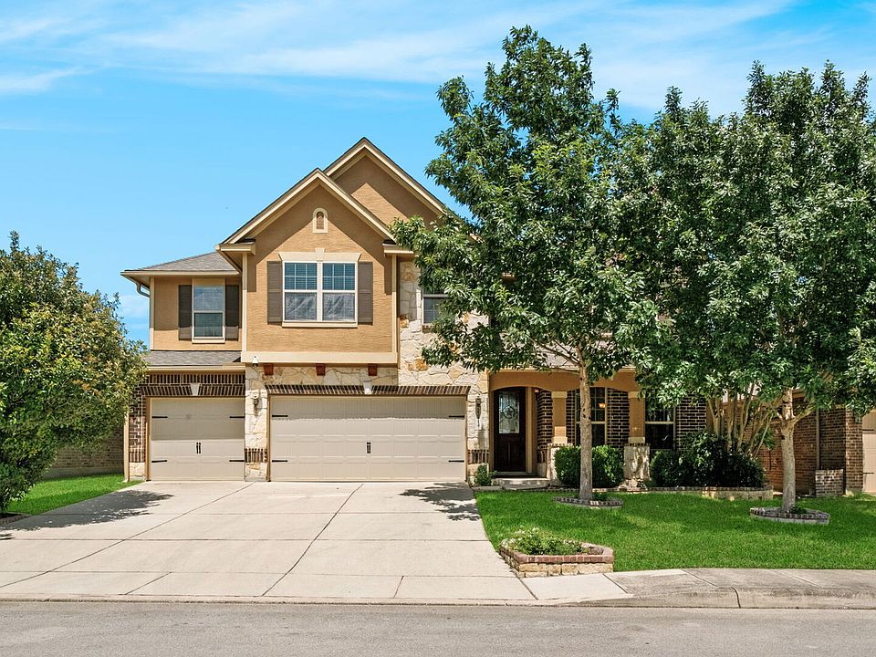 Located in the heart of Wortham Oaks and The Enclave-an exclusive gated community-this impressive two-story stone and brick home features a spacious three-car garage and meticulously maintained landscaping. Elementary and soon to open new middle school, both within walking distance. With over 3,000 square feet, this 4-bedroom residence offers two distinct living areas, granite countertops that elevate the kitchen space, and a Florida room for year-round enjoyment. Soaring vaulted ceilings and a stone fireplace create a warm and welcoming atmosphere from the moment you enter. Additional highlights include two water heaters and a water softener system. The home also includes solar panels, providing energy efficiency and long-term utility savings. The expansive covered porch includes ambient lighting along the fence line and backs up to a greenbelt-offering enhanced privacy and a peaceful outdoor setting with no rear neighbors. The kitchen is thoughtfully equipped for both daily use and entertaining, featuring stainless steel appliances, a gas cooktop, an island, built-in oven and microwave, and a convenient coffee bar. For meals, choose between the formal dining room or the bright breakfast nook. The primary suite is a quiet retreat with its own sitting area, while the en suite bathroom includes an extended walk-in shower and a separate garden tub for added comfort. Residents of Wortham Oaks enjoy access to community amenities such as a pool, clubhouse, basketball court, and park-enhancing the appeal of this standout home in a highly sought-after community.