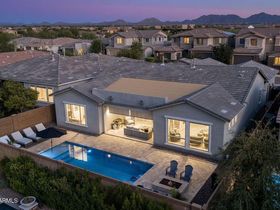 Modern Desert Luxury Meets Effortless Family Living in highly desirable Sky Crossing! Expanded 3,370 sf Patagonia model blends elegance and comfort with 3 BRs, office, and bonus room that can convert to 4th BR. Gated courtyard with custom iron gate opens to a sophisticated interior with plank tile floors, tray ceilings, and a chef's kitchen featuring a waterfall granite island, counter tops, 5-burner gas cooktop, double convection ovens, huge walk in pantry, shaker style cabinets. Split layout offers privacy for the serene primary suite w/ spa-style shower. Outdoor living includes Pebble Tec pool, travertine patio, and fire pit lounge. 3-car gar., epoxy floors, built-ins & ceiling storage. Walk to community rec. center, & Sky Crossing Elem. Easy access to Desert Ridge, High St., & FWY.