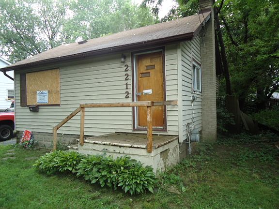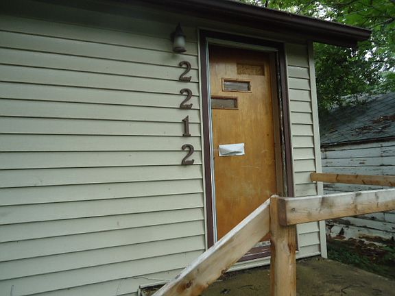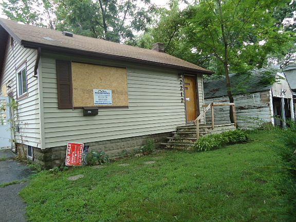 Exterior Features:A small ranch house with vinyl siding and a asphalt shingle roof that is in good condition. There is a 1 car dettached garage with a paved driveway. The backyard is fully enclosed with a wood fence. Most of the windows on the house have been boarded.Interior Features:The house has been pretty much stripped. The kitchen cabinets are still intact and vinyl tiles on the floor. The sink and cabinet are still in the bathroom. The tub and toilet are missing. The living room and the bedrooms have wood floors that need re-finished. The house has a full basement with all mechanicals missing.