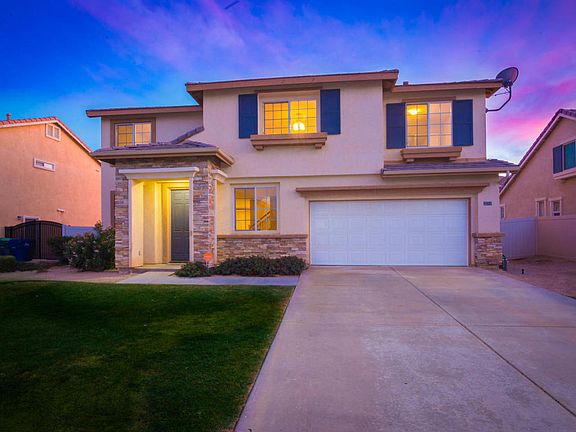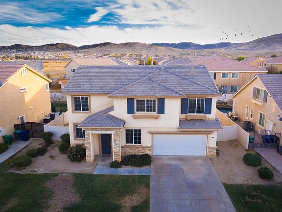 Stunning West Palmdale home in prime location near mall and Highland High School enter. Into your living-dining area, large tile flooring, dining area, carpet and recces lighting . Open-Concept kitchen features maple cabinets with pantry, granite counter-tops stainless steel double bowl sink with pulldown faucet, black appliances, and large island perfect for prepping and entertaining; kitchen over-looking family room area which displays modern gas fireplace with mantel, ceiling fan lighting, and living room. Bedroom and bathroom downstairs is perfect for guests. Upstairs hallway also has cabinets, large loft with ceiling fan, leads to bedrooms with mirrored closet doors. Hallway bathroom displays tile flooring with shower/tub combo. Double door entry to master bedroom with high