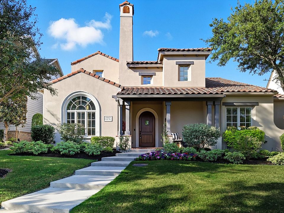 Gorgeous Highland- built Mediterranean inspired home with a classic stucco & tile roof exterior nestled in the heart of Austin Waters facing a serene greenbelt with beautiful trees & landscaping. Enjoy morning coffee on the spacious front porch with views of that greenbelt! Incredible wide open floor plan with soaring ceilings & abundant natural light throughout. All bedrooms have ensuite bathrooms! Private primary retreat, secluded in-law retreat with ensuite bath plus study on the first floor! 3 fireplaces: study, family room & outdoor living! Extensive real hardwoods: foyer, study, dining, kitchen. breakfast, family, primary bedroom, staircase & hall upstairs! Stylish gourmet chef's kitchen with tons of cabinets & prep space, large eat-in island, hi-end commercial appliances which also includes a built-in KitchenAid Refrigerator! The upstairs offers two large secondary bedrooms with ensuite baths, a game room with custom wet bar & media room equipped with screen, projector & built-in speakers & Subwoofer! Oversized full 3-car garage. Large laundry room with sink, cabinet storage & front load washer & dryer! Spectacular hi-end custom private outdoor living perfectly designed for entertainment: multiple sitting areas, lush landscape, wood burning fireplace, fire pit, grilling station plus enough yard space for pets. Additional updates include: paint, designer lighting, 3 Daikin HVAC systems, 2 new hot water heaters, Pella Windows at study & in-law suite, 8 foot privacy fence & more. This home is amazing. A must see!