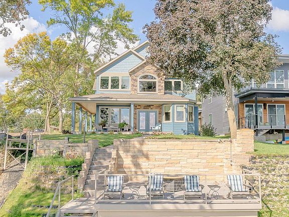 Check out this stunning one owner, custom built home with the indisputable best view on West Lake Okoboji. This well designed 4 bedroom (4th bedroom non-conforming) and 3 Bath 2 story Lakehome with 3,838 sq. ft. is on the West side of West Lake directly across from Arnold's Park. During the day, the view is spectacular. At night, the lights on the Roller Coaster, the Ferris Wheel, the Amphitheater at Preservation Plaza and the Promenade provide a truly magical sight. The main level features an inviting, open concept Great Room with a spacious Kitchen offering a walk-in pantry, custom Hickory cabinetry and stunning ceramic backsplash and countertops. The see through fireplace in the Great Room, opens into a cozy Den on the opposite side. A first floor Guest Room and full bath/powder room, as well as a laundry/mud room are also on the main floor. Spanning the entire width of the house on the second floor, the Master Suite has the same amazing view as the first floor. The Master Bath features dual sinks in a high vanity, deep soaking tub, and a separate room with a walk-in tile shower and toilet. And a well designed walk-in closet completes the Master Bedroom/Sitting Room. An upstairs Laundry Room, another Guest Bedroom, full Bath and a Family room (which has a closet and could be a 4th Bedroom) complete the second floor. There is also a charming, 450 sq. ft. vintage Guest House, which was here when the property was purchased in 1970. The 2 bedroom and 1 bath Guest Cottage was renovated before construction on the main house began in 2015; the Guest Cottage has new siding, a new roof, all new windows even the little square tub was re-enameled. After the Lake bank collapsed in the storm of June 2024, the bank was completely restored, stabilized and secured using geo engineering plans and renovation was done by Shore Team 6. The new aluminum stairway to the Lake, with powder coated aluminium railings and Cable Tram give you easy access to the water. The original retaining wall stood strong and still surrounds a beautiful lower patio, with powder coated aluminum cable railings - there's no obstruction of the breathtaking view!!