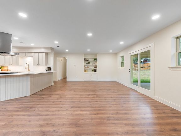 appliances. The open concept kitchen, dining, and living area is enhanced by custom built-ins