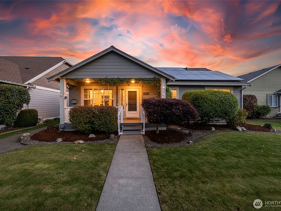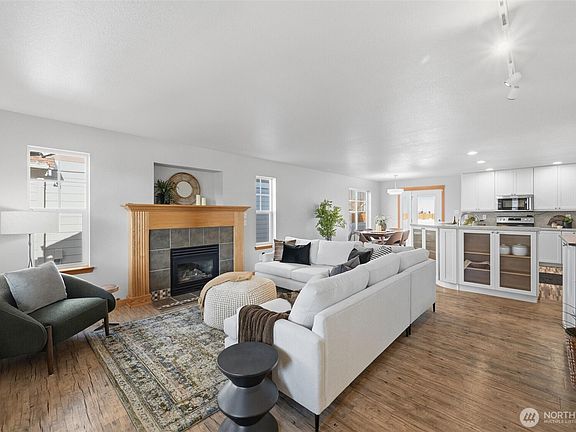 Beautifully updated single-level home in a peaceful Lynden neighborhood! This 3-bed, 2-bath gem features a remodeled kitchen with custom built-ins, open floor plan, cozy gas fireplace with custom mantle, and stylish tile walk-in shower. One bedroom is perfect as a home office with built-in cabinetry. Enjoy year-round comfort with A/C, newer furnace, roof, and energy-saving solar panels. Step outside to a fenced backyard with low maintenance turf, hot tub, and alley-access two-car garage. Fresh exterior paint, covered front porch, and close proximity to a nearby park and sidewalk-lined streets make this a standout choice. Whether you're downsizing or buying your first home, this well-maintained home offers comfort, convenience, and charm!