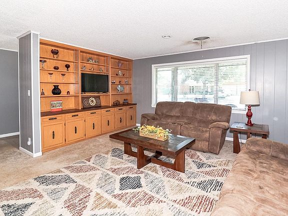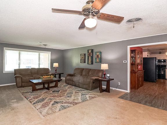 Warm and welcoming! Step into this 3 bedroom, 2 bath home and enjoy the cozy vibes. The open and spacious living area boasts a wall of built-ins for the book enthusiast and has a unique curved fireplace for those cozy, cold winter evenings ahead. The updated kitchen features a stylish modern tile backsplash, black appliances, breakfast bar, ample cabinet space, and the utility room is tucked away right around the corner with a pantry. The 2nd and 3rd bedrooms have great closet space and built-ins that minimize the need for additional clothes storage. The primary bedroom is spacious with it's own private bathroom, dressing area, and fantastic walk-in closet. The concrete patio out back offers a great place to cook and entertain, while the 2 storage buildings give home to all the yard equipment, tools, etc. Low maintenance vinyl siding on eaves and newer roof. Come see this great home today!