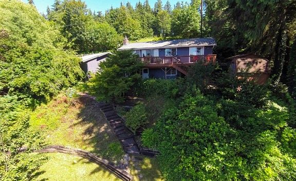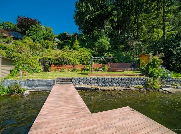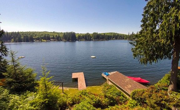 Lake Roesiger Waterfront home. 80 Feet of waterfront w/Dock! Enjoy the spectacular sunsets from view deck & deck! 2100 sqft, 3 Bedroom home w/Den too! Kitchen features hardwood floors, newer cabinets, granite counters & slider out to view deck. Living Rm & Family Rm both have fireplaces. Full size laundry rm. Detached 2 Car Garage + extra parking [a rarity around the lake!]. Gorgeous terraced pathway down to dock. Waterfront area features patio, outbuilding, wood stove & deck. Come take a look!
