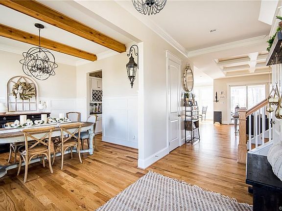 Beautiful custom home with several upgrades. This house has all the bells and whistles: coffered ceilings, hardwood throughout, even a custom built interior doghouse/playhouse. The attic space is partially finished with plumbing for a full bathroom and prewired for an additional air conditioning unit and cable. The stairs leading to the attic are finished with hardwood flooring. The lot backs up to preserved land so it is full of beautiful trees, a creek and privacy.