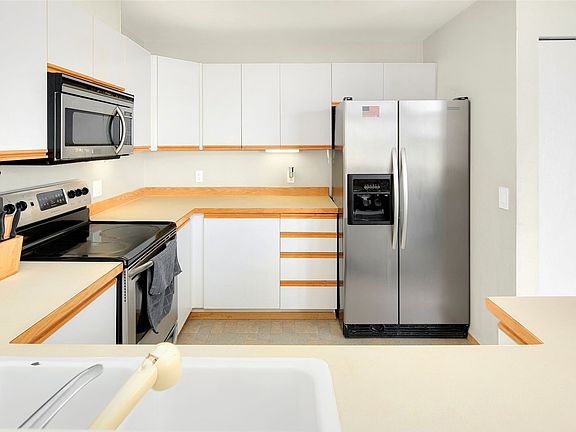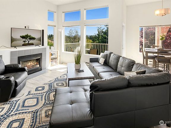 Light filled 2 bedroom/2 full bath end unit condo in sought-after Ridge at Riverview. Desirable top floor living with an open concept floorplan, soaring 12’ ceilings, huge windows, and private balcony with majestic mountain views. Cook’s delight galley style kitchen with abundant counter/cabinet space, stainless steel appliances, and breakfast bar. Spacious primary bedroom suite features large walk-in closet and adjoining bath with double vanity. Large second bedroom perfect for a home office. Full size washer & dryer in unit. Attached/secure oversize one car garage parking plus extra storage. Plenty of guest parking nearby. Community playground. Close to shopping/dining. Just minutes to I-5, Hwy-516/167, SeaTac, Lightrail, and Green River