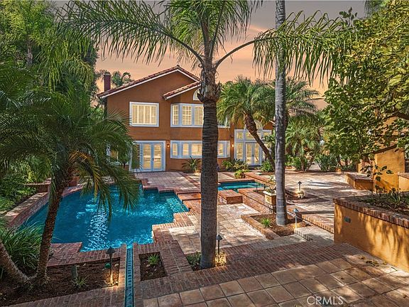 Rare and Private Corner Lot that measures over 10,000 square feet in the prestigious guard gated community of Canyon Crest’s Gallery Collection. This Mediterranean style home has one of the most impressive and serene backyard spaces that you will find. Custom brick and concrete architectural hardscape surround the pebbletec pool and spa, outdoor gas fireplace with mosaic tile and a top tier lounge area with a stunning water feature that streams down into the pool. The grass area and lush landscaping surround the entire property, creating total privacy and seclusion. This exceptional home presents towering vaulted ceilings, elegant stone inlay floors, Dual Pane wood clad windows with beautiful wood casings, plantation shutters, wrought iron stair rail, 3 gas fireplaces and an exceptional open concept floor plan with a downstairs bedroom/office and full bathroom. Your stunning chef’s kitchen overlooks the massive rear yard and features custom cabinetry, Sub Zero refrigeration, commercial Decor range and lime stone countertops. Traversing upstairs, you will find a huge bonus room with vaulted ceilings, two generous guest bedrooms that share a jack and jill bathroom and your stunning primary suite. The primary bedroom showcases a private balcony, a large walk-in closet and a luxurious remodeled primary bathroom with a soaking tub and separate glass enclosed shower. The Canyon Crest community offers unparalleled amenities including but not limited to: A beautiful clubhouse, fitness facility with dry saunas, tennis & pickleball courts, an amazing lap pool and kids pool, basketball court, tot lot, BBQ area, green space, billiards room, plus membership to Mission Viejo Lake.