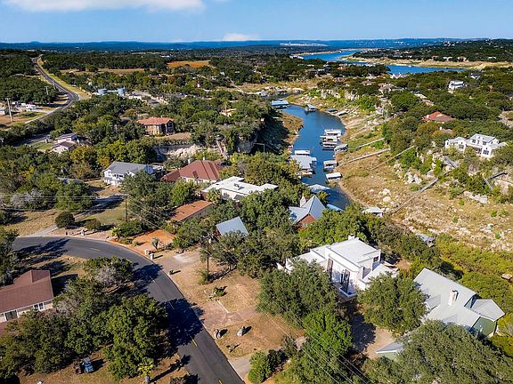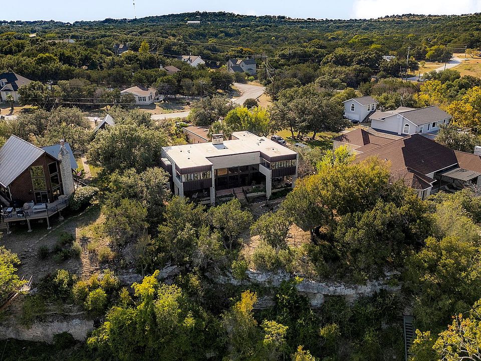 A stunning blend of retro charm and modern sophistication awaits in this sprawling 70s-style home, perfectly situated in the amenity-rich Briarcliff community. This waterfront home is designed to take full advantage of its breathtaking surroundings, with amazing views of the Colorado River and Lake Travis, plus an inlet directly behind the home. A personal dock with a boat lift conveys, offering effortless lake access. The reflective white TPO roofs enhance its modern aesthetic and significantly reduce energy costs. Lush xeriscaping blends tropical and native plants for a striking, low-maintenance landscape. Inside, terracotta floors downstairs provide lasting beauty, while floor-to-ceiling windows flood the space with light and frame the magnificent views. Built with fossilized limestone and steel beam framing, the home features spalted pecan trim and engineered Brazilian hardwood upstairs. The wrap-around porch, finished with terracotta tile, is an entertainer's dream. Shaded and private, it’s ideal for relaxing or gathering. Ceiling fans add a cool breeze while preserving the stunning views. The custom kitchen includes ample glass-inset cabinets, a conductive cooktop surrounded by windows, and an extra prep sink. A breakfast/coffee bar completes the space. With two fireplaces, abundant skylights, and natural light throughout, this home is made for comfort. Tropical interior elements add a unique sense of escape with elegant fixtures and design touches. Located in Briarcliff, enjoy access to a marina, trails, golf, a dog park, pickleball, and more. Just a short drive to Hill Country Galleria and Lakeway’s shops and dining. Don’t miss your chance to own this one-of-a-kind gem—schedule a private showing today!