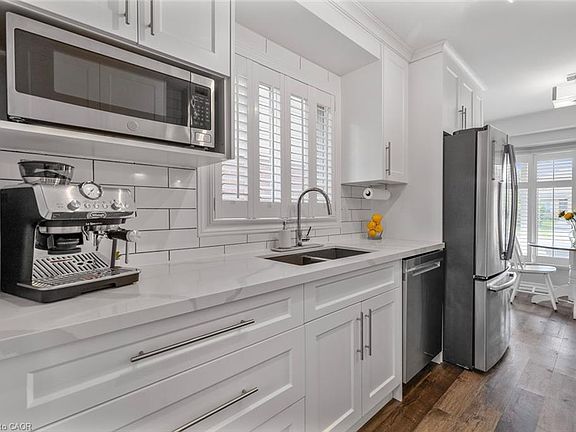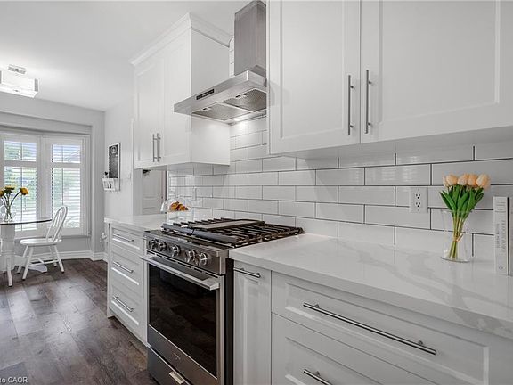 Welcome to 2213 Hunt Crescent, a beautifully updated 2-storey home in Burlington's desirable Headon Forest neighbourhood. This 3-bedroom, 2.5-bath residence blends modern upgrades with family-friendly comfort across 1,400 sqft of thoughtfully designed living space. The heart of the home is the renovated kitchen featuring white shaker cabinetry, quartz countertops, stainless steel appliances, a gas range, and chic subway tile backsplash. Dark wide-plank flooring runs throughout the home, adding warmth and contrast. The living area offers a custom built-in entertainment unit and electric fireplace the perfect gathering space for cozy nights or entertaining guests. Upstairs, the oversized primary retreat includes a spacious walk-in closet with custom cabinetry and a newly updated ensuite bath. Two additional bedrooms share a beautifully renovated main bathroom. Step outside to enjoy the large rear deck, ideal for summer barbecues or peaceful morning coffee. Recent upgrades include flooring throughout, driveway, and a newly rebuilt front porch. Situated in a quiet, family-friendly crescent, this turnkey home is just steps from St. Timothy's and Notre Dame schools, parks, and walking trails with quick access to QEW and 407. Move-in ready and full of thoughtful upgrades, this is your chance to enjoy life in one of Burlington's most sought-after communities.