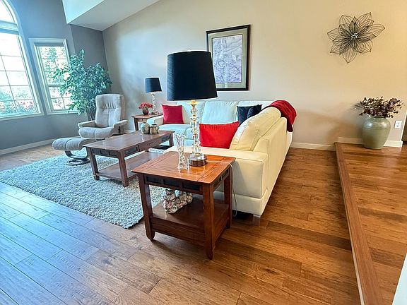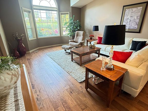 Large living room and dining room on the east side have cathedral ceilings and a beautiful bay window.