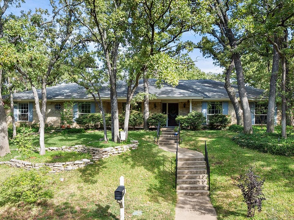 Tucked away on a quiet cul-de-sac in the desirable Tanglewood Addition, this spacious single-story home offers a peaceful retreat on nearly an acre in the heart of Arlington. From the moment you arrive, the curb appeal impresses - layered stone landscaping, mature oaks and a welcoming covered front porch set the tone for the warmth found throughout. With a thoughtful layout and timeless character, this property combines everyday comfort with natural serenity. Inside, you’ll find multiple living and dining areas designed for flexibility, entertaining or multi-generational living. The main living room features a cozy brick fireplace with raised hearth, built-ins and flows into the light-filled sunroom - perfect for morning coffee, hobbies or simply enjoying views of the lush, tree-lined backyard. The kitchen includes 42” cabinets, a gas cooktop and plenty of counter space with a convenient breakfast bar and adjoining breakfast nook. A private office with built-ins offers the ideal space for working from home and could be used as a fourth bedroom. The primary suite features an ensuite bath with dual sinks, separate vanities, a garden tub and walk-in closets. Two additional bedrooms each include built-ins and ample closet space, with a full bath nearby for guests. Step outside to a large deck and covered patio area ideal for outdoor gatherings or quiet evenings under the trees. The backyard provides a natural escape with terraced landscaping and plenty of room to explore. Practical features include a 3-car carport plus a 2-car garage with rear access, an AC unit less than six years old and several Pella windows throughout the home, some with Bali blinds for added privacy and style. Minutes from shopping, dining, parks and entertainment - including Lake Arlington, I-30 and DFW attractions - this home offers both tranquility and convenience.